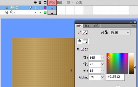 5、雙擊進入編輯,新建一層,R鍵調出矩形工具,線條色禁用,拉出一個足以覆蓋箭頭的矩形,顏色面板中將填充色Alpha值設為0%。因為箭頭有很多空白,鼠標點擊時易點空,添加一個看不見的矩形,使整個箭頭范圍都可以被點擊。