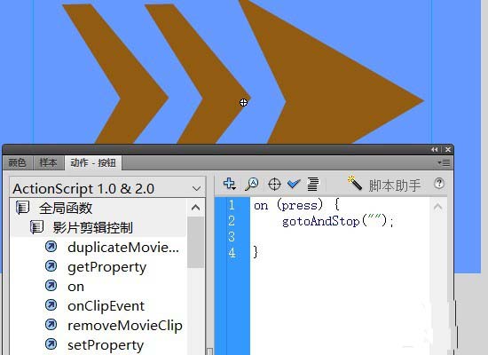 6、回到場景,選中按鈕,在動作面板中輸入點擊該按鈕,進入某幀并停止(或播放)的命令即可。
