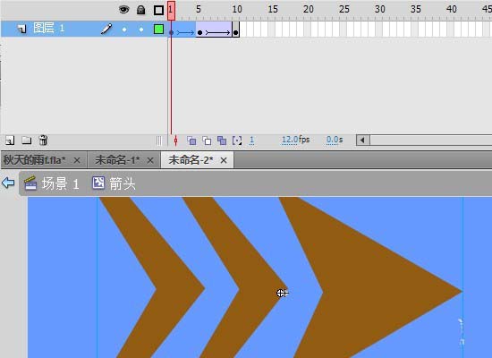 3、雙擊進入編輯,在第5幀按下F6鍵插入關鍵幀。將后面兩箭頭略向前移。回到第一幀創建傳統補間。