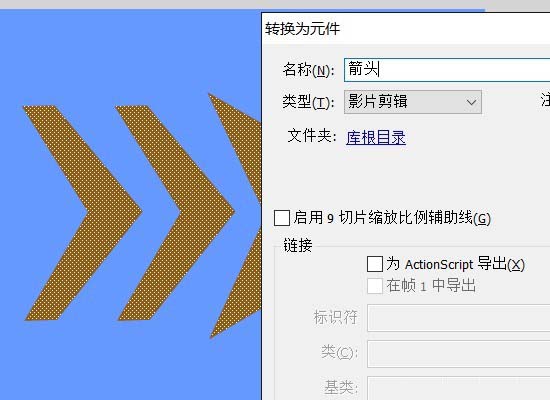 2、F8轉換為影片剪輯元件,取名“箭頭”。