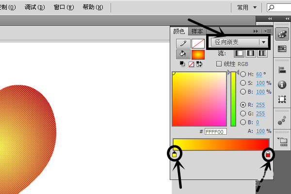 8、然后,在顏色面板中,將其左邊的色塊調味黃色。右邊的色塊調為紅色。