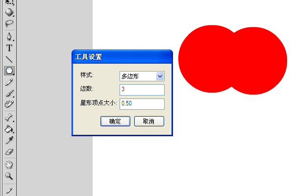 3、然后,在舞臺上畫一個圓;畫好后,再復制一個。并把它移到合適位置(如下圖),然后再在矩形工具那一項找到多邊形工具,然后再在右邊的屬性面板中找到一個選項按鈕,點擊按鈕,就會彈出一個對話框(如下圖),改變樣式為多邊形,邊數為3,單擊確定。