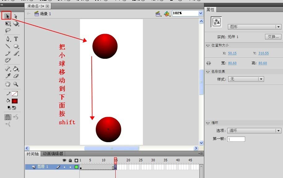 4、選中15幀(可以自己選擇),按住F6(插入關鍵幀),把小球移動到下面。