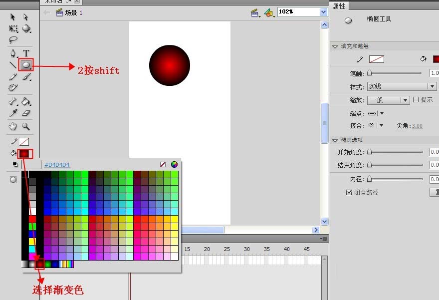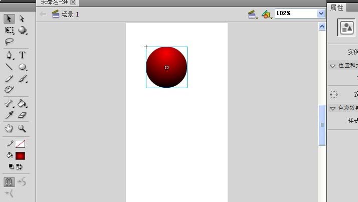 1、新建舞臺,設置200*400,按ctrl+2,把舞臺全屏。選擇漸變色,按shift畫出小球。