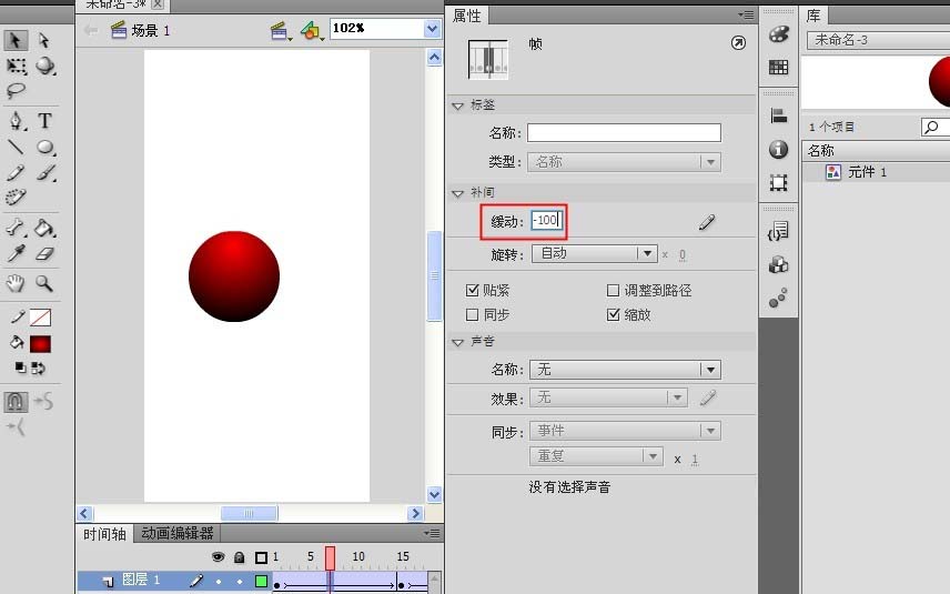 7、小球跳動就做完了,我們來設置一下上下小球的速度,小球下降時速度快,選擇屬性把緩動設置為負數,數值越大速度越快。相反,小球上升時速度慢,把緩動設成正數,數值越大越慢。