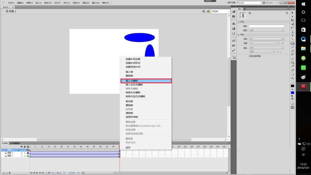 3、在時間軸上選擇一個幀,這里我選的是第70幀,右鍵,點擊“插入關鍵幀”