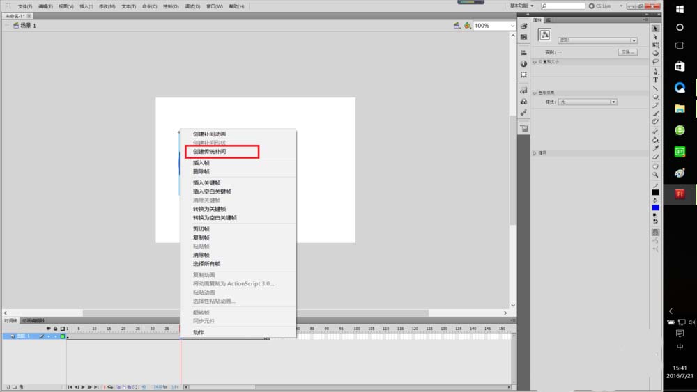 5、在第一幀和最后一幀的中間幀上,任意選擇一幀,右鍵,點擊“創建傳統補間”