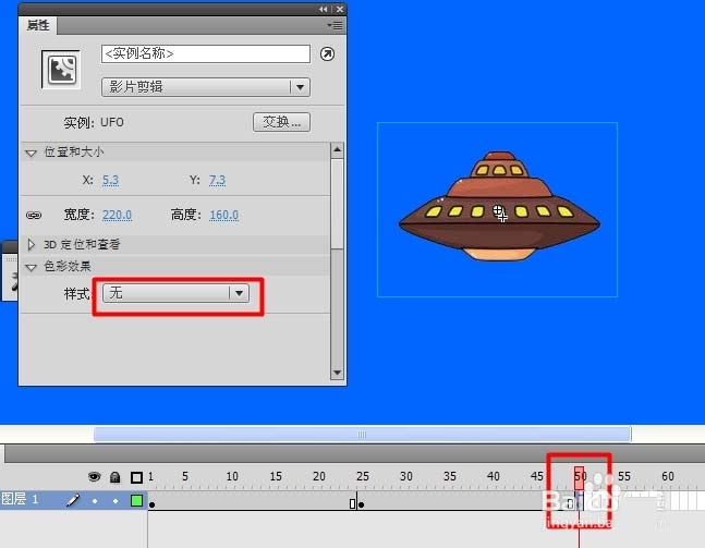4、在50楨插入關鍵楨,將UFO設置成第一楨的效果,然后在兩個關鍵楨之間右擊,選擇“創建傳統補間”項。最終創建如圖所示的UFO閃爍效果。此步大家也可以根據需要進行自由創作。
