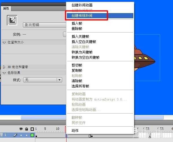 8、最后右擊,創建“傳統補間動畫”,就制作完成啦。按“Ctr+Enter"就可以進行測試啦。