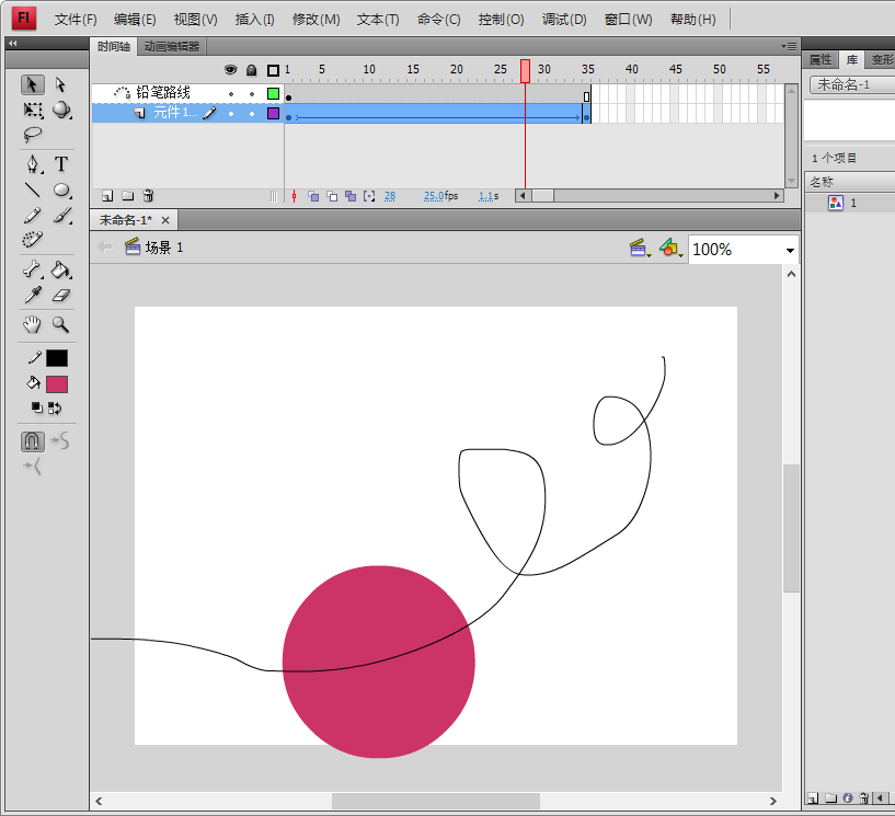 3、回到場景1,利用鉛筆工具,隨意畫一條路徑