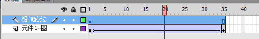 在圓的第一幀處,將圓的中心放置鉛筆的路徑上,在第35幀,按下F6,插入一個關鍵幀,同樣,將圓的中心放置鉛筆的路徑上,如圖所示。(將圓的中心放到路徑上,是為了圓能夠和路徑重合,這個時候工具欄左邊的吸鐵石工具一定要處于按下的狀態(tài) )