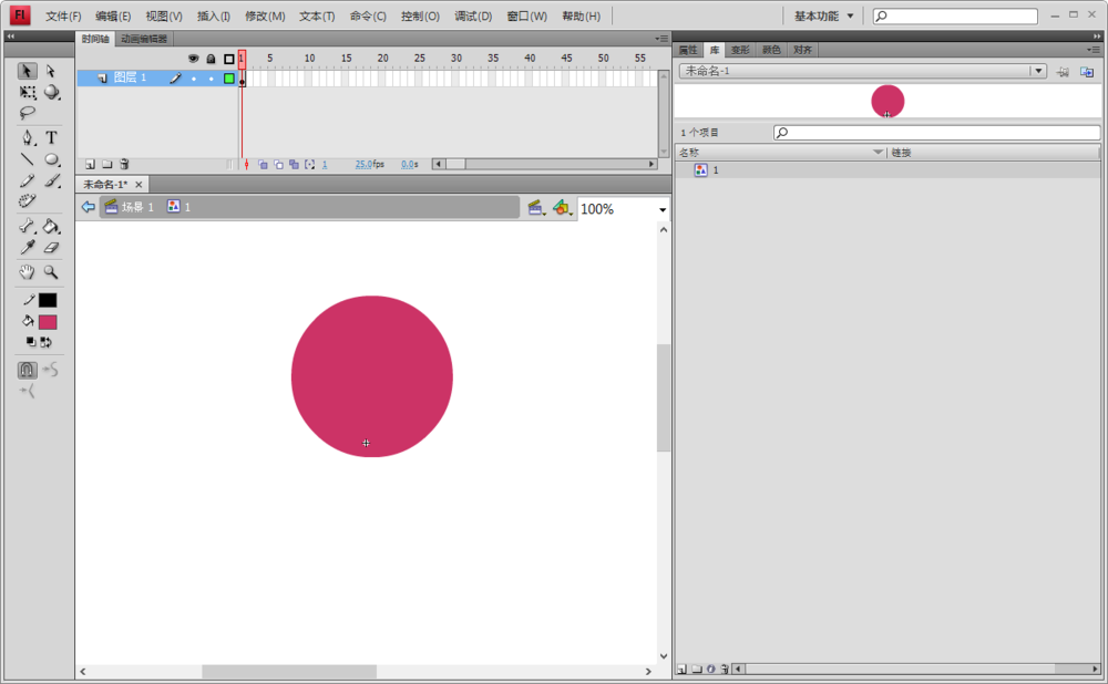 2、這里,我演示一個紅色圓的路徑動畫,利用快捷鍵ctrl+F8新建一個元件1,畫一個圓