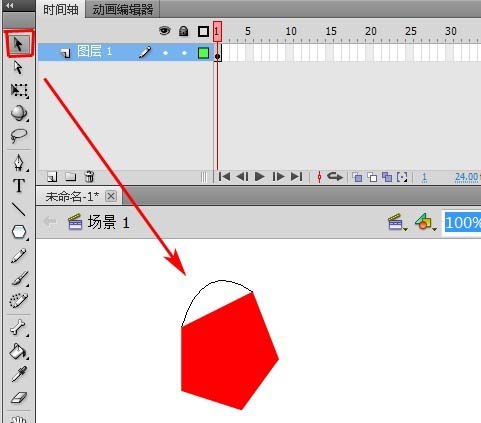 6、選中“選擇工具”,讓鼠標指向五邊形的任意一條邊上,當鼠標附近出現曲線指針時,拖動鼠標來調整曲線。