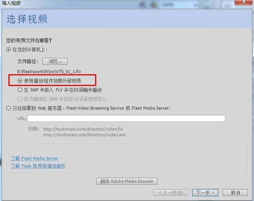 11、 使用組件加載外部FLV。在導入視頻窗口中,首先出現的是選擇視頻項,要求我們選擇視頻。因為在上一步我們采用了“拖放”的方法,所以已經解決了選擇視頻的問題。故,我們只要采用默認的模式就可以了。點窗口底部的“下一步”按鈕即可。