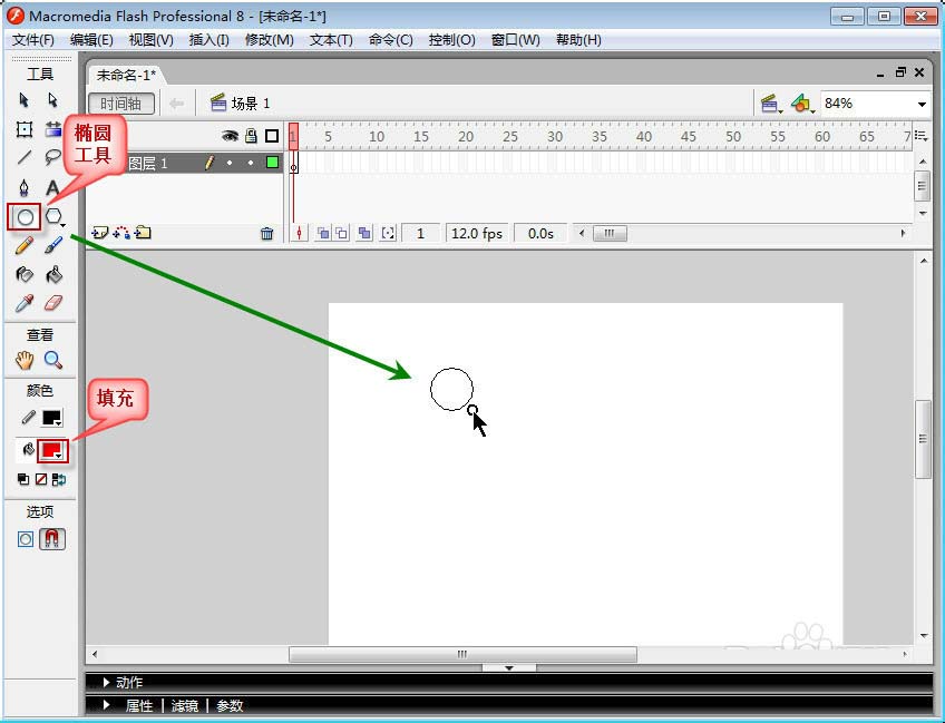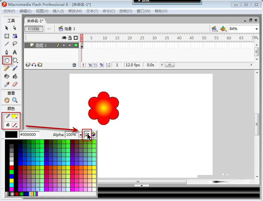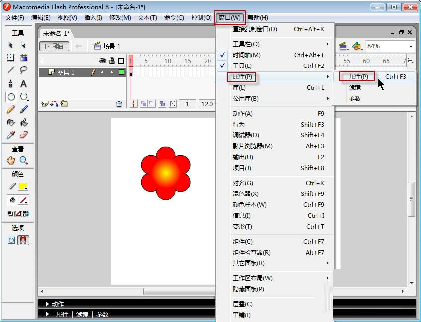 6、下邊我們來加花蕊。選擇圓形工具線條選黃色,填充選擇沒有。在【窗口】中找到【屬性】。設置線條的粗細和形狀,花蕊是點點,所以我們選擇點形線條,然后在花心那里畫個矩形,OK,漂亮嗎?