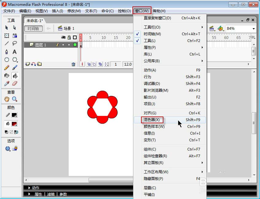 4、單擊五次后,就會看到六瓣已經出現了,單擊一下花瓣附件的空白,在【窗口】命令中找到【混色器】。