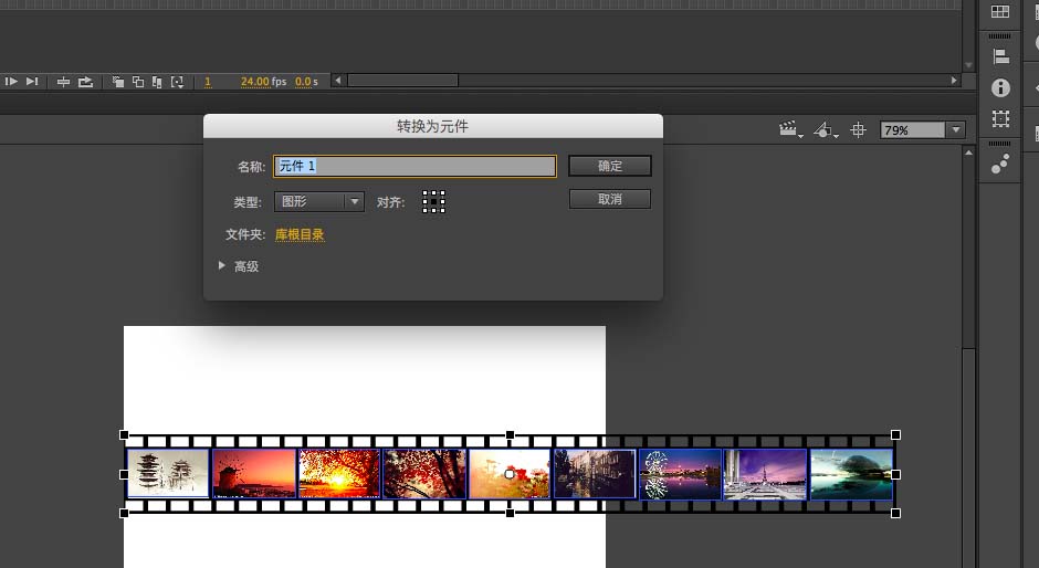 11、然后將其轉(zhuǎn)化為元件,剩下的就是動(dòng)作的部分,不用多說大家也知道,膠片在滾動(dòng),所以在第60幀處插入關(guān)鍵幀,將尾部與右邊緣對齊,創(chuàng)建傳統(tǒng)補(bǔ)間
