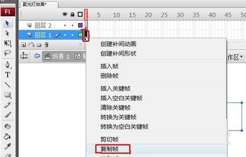 19、選擇元件“圖層2”中第1幀,右鍵選擇“粘貼幀”