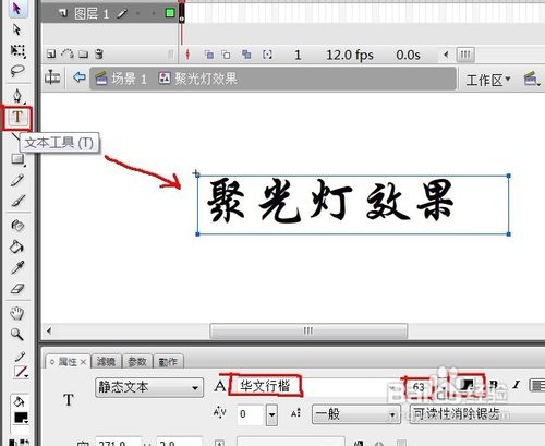 13、在元件“圖層1”第1幀,用“文本工具”在頁面輸入文字“聚光燈效果”,并設置“字體”、“字號”、“顏色”