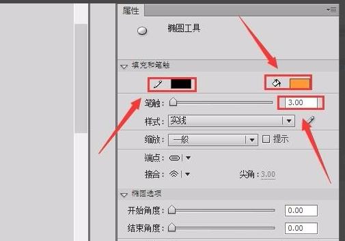 5、選擇橢圓工具,在屬性里調(diào)節(jié)筆觸顏色為黑色,填充色為白色,筆觸大小為3,如圖所示: