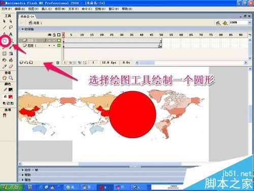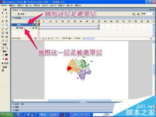 14、現在遮罩動畫已經成功完成了,什么是遮罩呢,其實我們這個動畫中的圓形就是遮罩層,地圖那一層就是被遮罩層。遮罩就是通過遮罩層可以看到被遮罩層的東西!被遮罩層的其他內容將不會再看到!