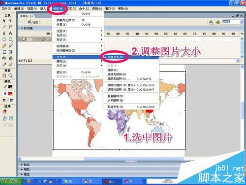 3、圖片導入到舞臺上后,如果大小不合適,你可以自己修改圖片的大小,盡量讓圖片細長點!當然這一步可以省略!