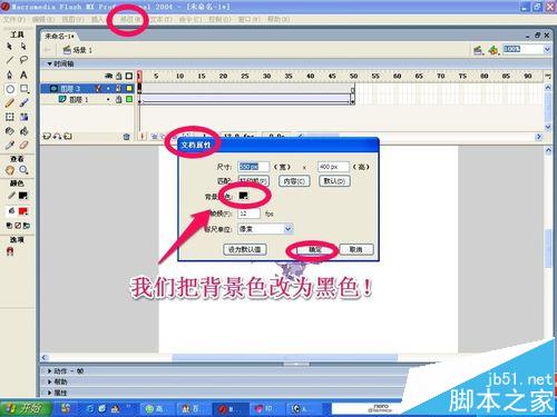 16、為什么不太好看呢?那是因為我們舞臺的背景色是白色的,我們可以把背景色改為黑色的。通過菜單修改-文檔-文檔屬性進行更改!更改后我們再看看動畫的效果,是不是很漂亮呢!自己試試吧!