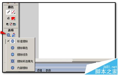 3、點下選項的第一個,下方彈出了5種橡皮擦工具;每一種橡皮擦功能不一樣;勾選第一種“標(biāo)準(zhǔn)擦除”橡皮檫;可以把舞臺上的圖形擦除顏色;如下圖所示;