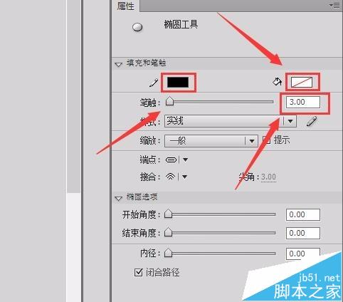 9、再次在工具箱里選擇橢圓工具,在屬性里調節筆觸顏色為黑色,填充色為無,筆觸大小為3,繪制一個橢圓作為眼睛的輪廓,如圖所示: