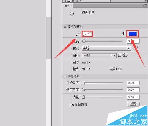12、再在工具箱里找到橢圓工具,并在屬性里設置筆觸顏色為無,填充色為藍色,如圖所示: