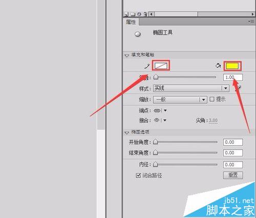 3、點擊橢圓工具,在右側的屬性里設置筆觸為無,填充顏色為黃色,如圖所示: