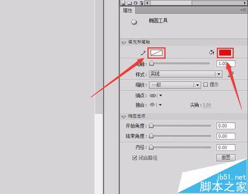 5、繼續在工具箱里選擇橢圓工具,在右側的屬性里設置筆觸為無,設置填充色為紅色,如圖所示: