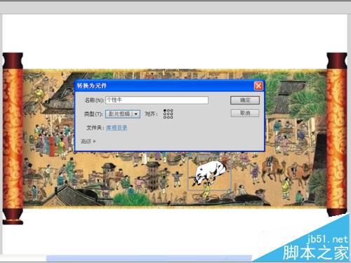 4、選擇“牛.png”這幅圖片,右鍵單擊從下拉菜單中選擇轉換成元件選項,在彈出的對話框中輸入名稱為“個性牛”,類型為影片剪輯,點擊確定按鈕。