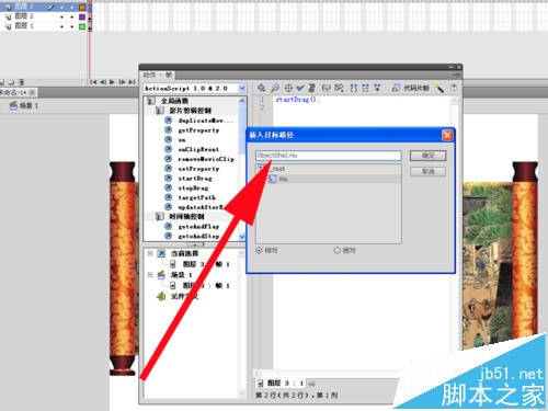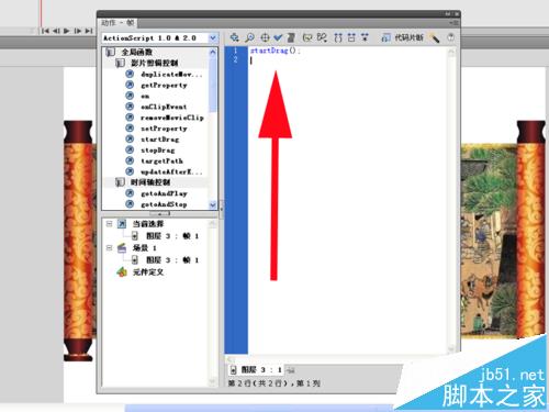 6、選擇圖層3的第一幀,打開動作面板,找到全局函數-影片剪輯控制-startdrag選項,插入startDrag();