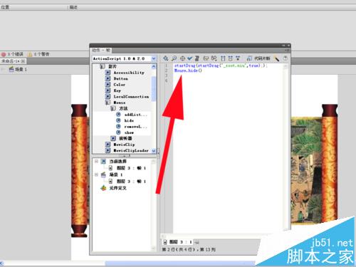 9、將光標置于下一行,找到actionscript2.0類-影片-mouse-方法-hide選項,將其插入。