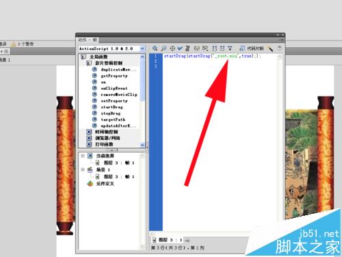 8、接著修改代碼startDrag();為startDrag(startDrag("_root.niu",true););