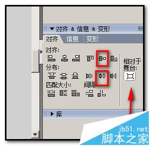2、再點選“選擇”工具,把此直線選中;然后,在“對齊”面板中,把“相對于舞臺”按鈕按下;然后分別點擊“水平居中分布”和“垂直中齊”圖標;把直線設置為相對于舞臺居中;