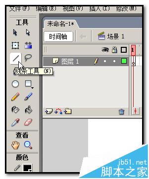 1、新建flash8文檔;點選“線條”工具,在文檔上畫出一條橫直線;直線寬度為135;