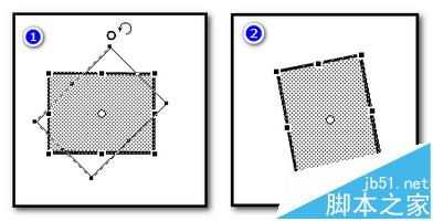 7、"任意變形”工具可以把圖形旋轉.把光標放在方形四個角的控制點外圍,光標呈半圓箭頭,如圖中所示;