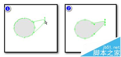 3、光標放在其中一個控制點上,光標右下方顯出一個空心的小方框;然后點住不放后,移動光標;可以把點住的這一端拉出形狀,而圓其它部分是不動的。放開鼠標,拉出來的形狀如圖所示;