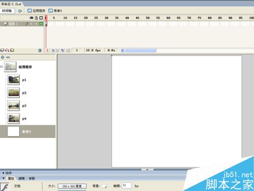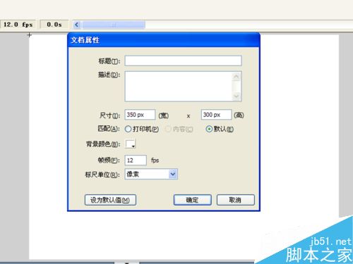2、點擊屬性,在屬性對話框中設(shè)置大小為350*300像素,幀頻為12fps,背景顏色為白色。