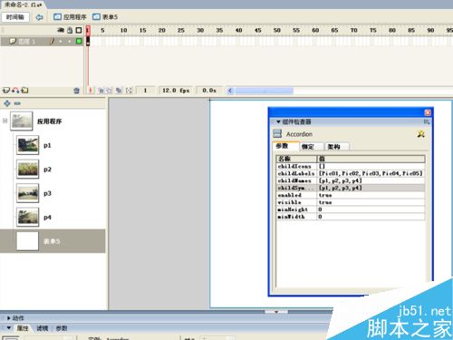 8、選擇表單5,選擇庫中的accordion組件拖拽到舞臺上,設(shè)置其大小為350*300像素,并設(shè)置居中對齊。