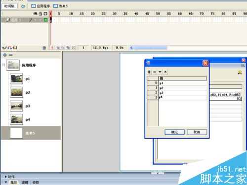 7、依次選擇屏幕p2-p4,并將庫中的圖片2-4依次拖拽到舞臺中,并設(shè)置其對齊方式為居中對齊。