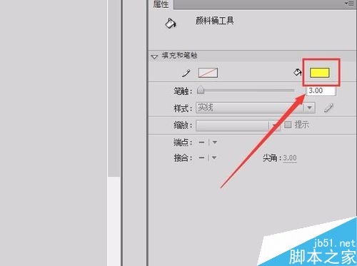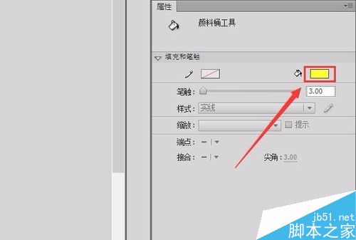15、選擇油漆桶工具,在屬性里調節填充色為黃色,如圖所示: