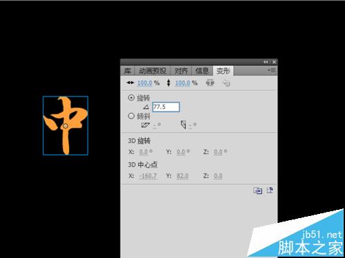 7、在圖層1的第二幀處插入關鍵幀,將元件2的旋轉角度設置為77.5度后,按回車鍵。