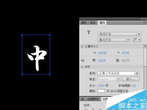 2、執(zhí)行插入-新建元件命令,新建一個名稱為元件1的圖形元件,確定后進入編輯區(qū)域,選擇文本工具輸入文字“中”,設置字體為王羲之書法字體,大小為120.
