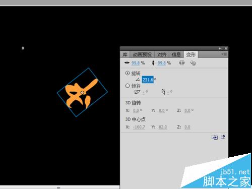 6、按ctrl+f8組合鍵新建一個名稱為元件9的影片剪輯元件,確定后進入編輯區(qū)域,將影片剪輯元件2拖拽到舞臺,打開變形工具窗口。