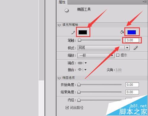 3、點擊橢圓工具,在下面右側的參數里調節填充色為藍色,邊框顏色為黑色,邊框的筆觸為3,如圖所示: