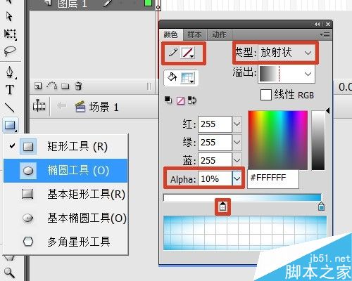 1、O鍵調(diào)出橢圓工具,顏色面板中將線條色禁用,類型放射狀,填充條設(shè)置如圖。藍(lán)色為#0CABE7,白色的alpha值10%,位置如圖放置。