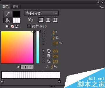 現(xiàn)在我們來畫一個放大鏡。先選擇橢圓工具,筆觸色為黑色,大小為8.填充色要在顏色面板里進行設置,打開顏色面板,選擇“徑向漸變”,然后在下面的調色條里,進行調色。調色時要注意,為了盡量使放大鏡真實一些,雙擊調色條第一個調色塊,顏色為白色(ffffff),Alpha為0,右端的調色塊顏色為白色,Alpha為20%。